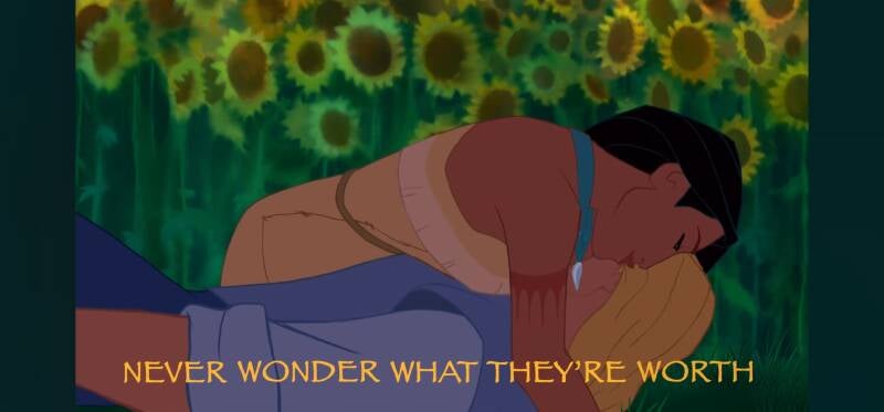 Before Pocohontas and the blue Captain fall into the waters in the Disney clip above,